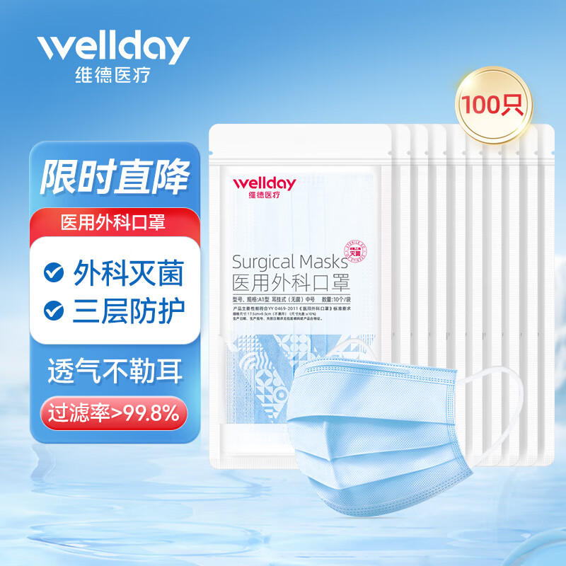 维德(WELLDAY)一次性医用口罩挂耳式三层无菌级防细菌飞沫轻薄透气防护隔离粉尘 【医用外科灭菌】蓝色100只-10只/袋