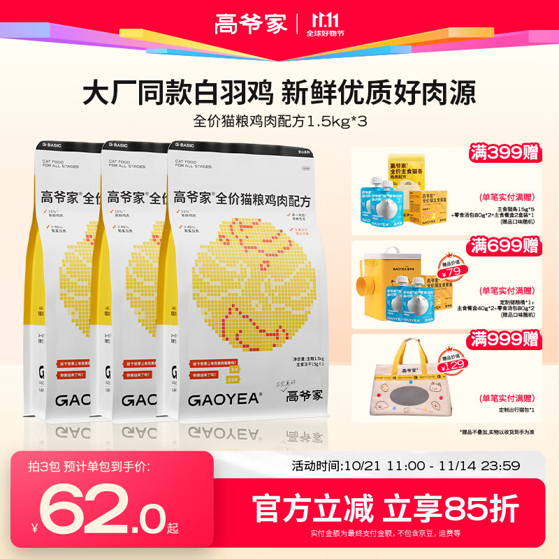 高爷家麦肯鸡全价猫粮 鲜肉含量31% 升级2.0鸡肉配方 麦肯鸡1.5kg*3包