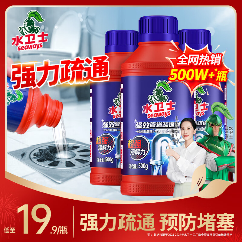 水卫士管道疏通剂 下水道疏通剂 厨房马桶卫生间管道强力疏通剂水卫仕 3瓶超值装【98%家庭选择】