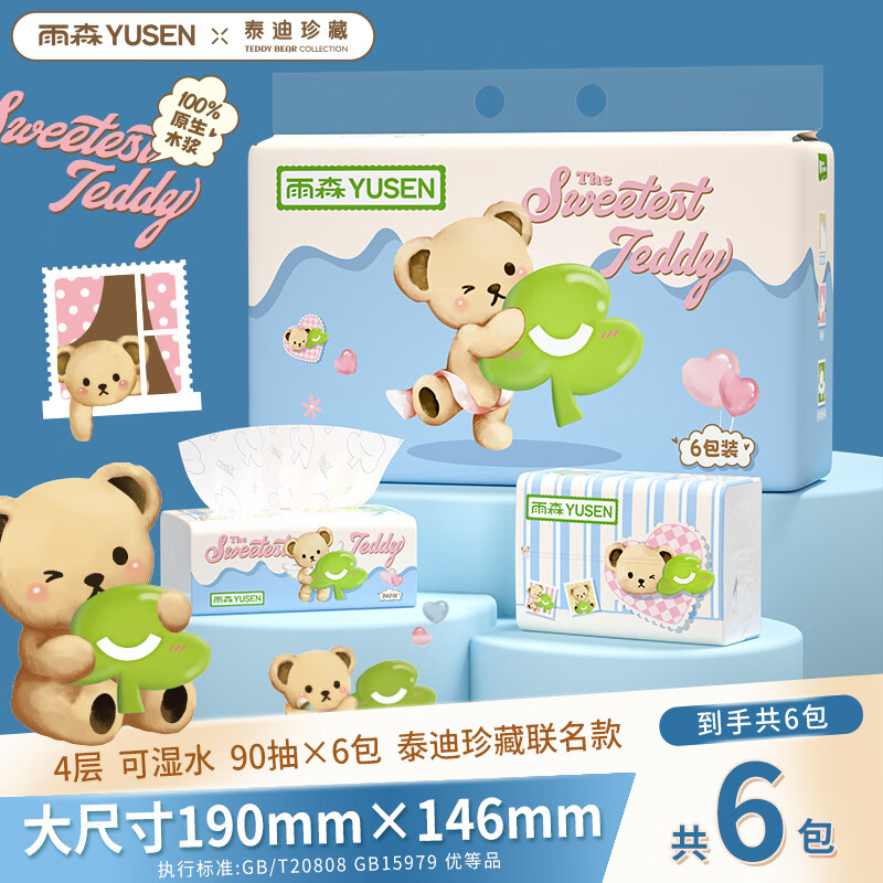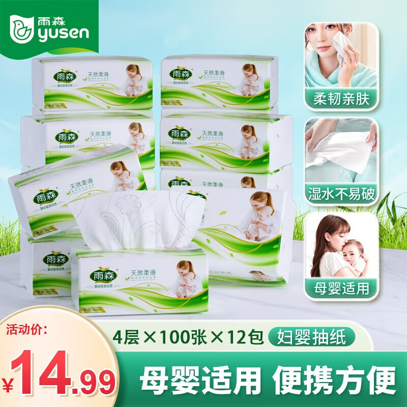 雨森妇婴抽纸母婴适用100%原生木桨家用纸抽4层加厚可湿水纸巾卫生纸 4层 100抽*6包 【热销款】