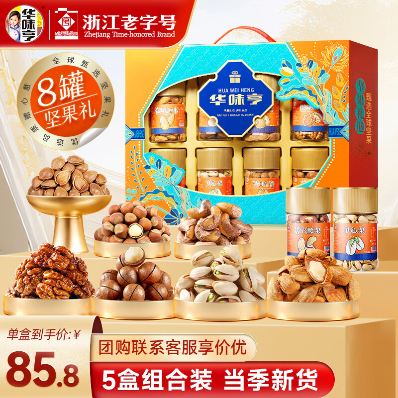 华味亨坚果礼遇坚果礼盒1110g/8罐 纯坚果团购送礼开心果核桃休闲零食 高端坚果礼盒1110g*5盒