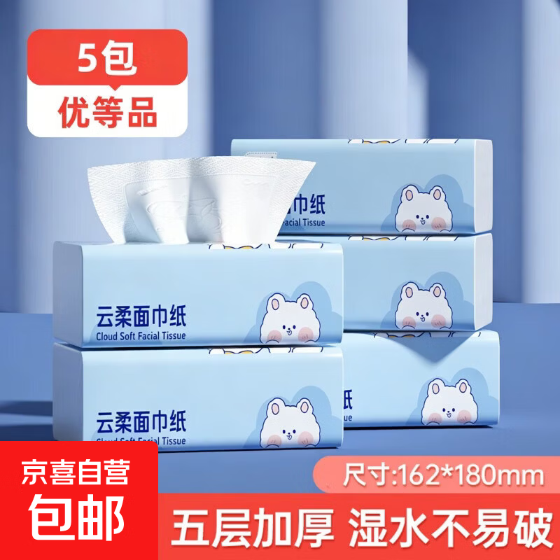 蓝漂纸巾面巾纸抽纸 5层加厚60抽 原生木浆 紧致四边压花锁边 5层 300张*5包