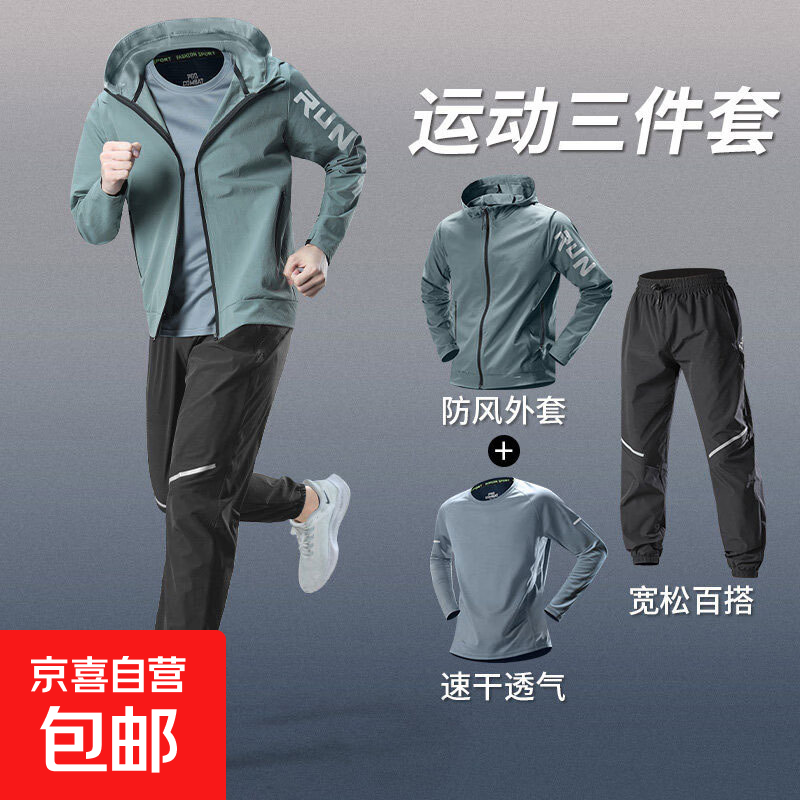 【跑步必备】跑步运动套装男秋季晨跑训练速干长袖长裤健身衣服 三件套、J91绿+T86灰+W281【速干-透气-薄款】 2XL 【140-160斤】