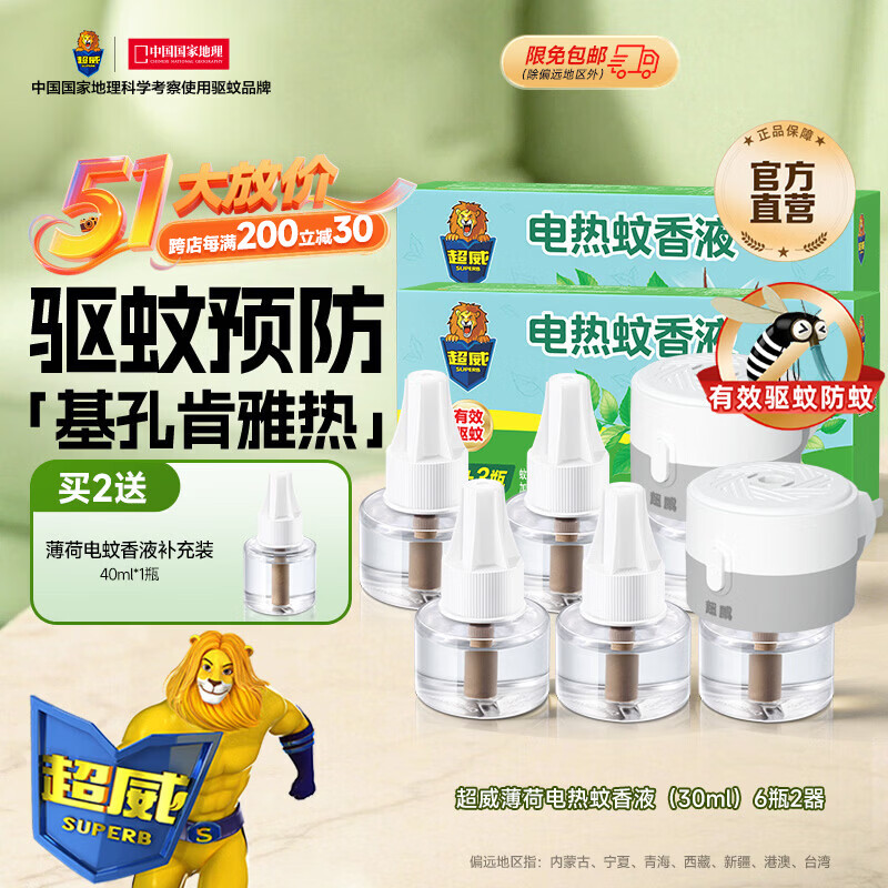 超威电热蚊香液驱蚊防蚊液家用套装品牌插电式加热器蚊香液 薄荷6液2器