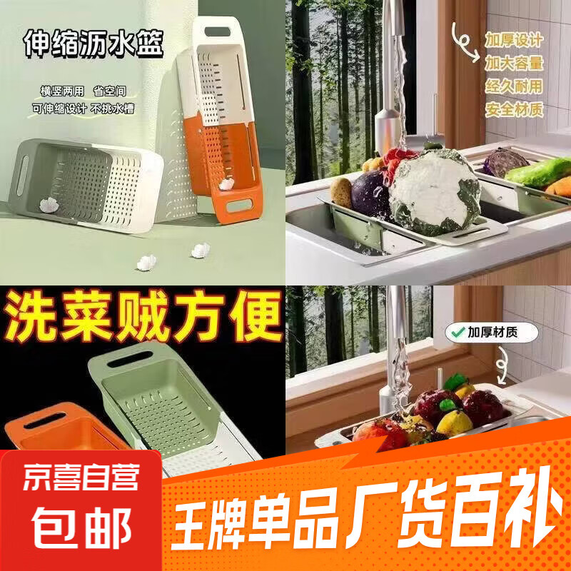 双层沥水篮洗菜盆厨房水槽洗水果蔬菜洗菜淘米篮伸缩洗菜篮沥水架 可伸缩沥水篮【绿白撞色1个】