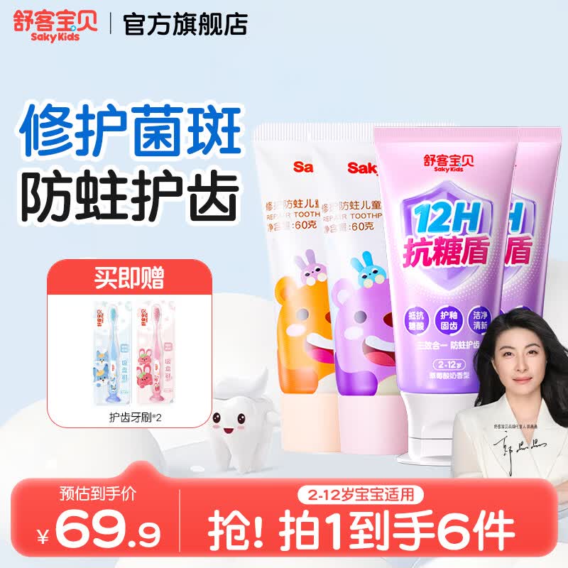 舒客宝贝儿童牙膏2-6-12岁换牙期含氟防蛀修护菌斑龋齿郭晶晶推荐婴儿牙膏 修护牙膏60g*2+抗糖防蛀60g*2