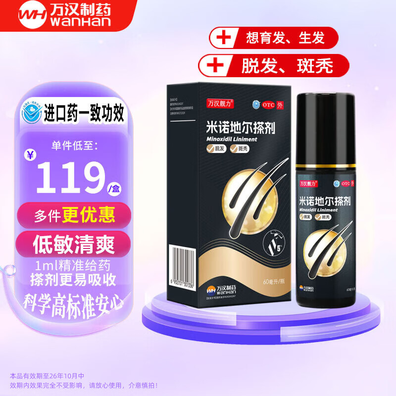 [万汉靓力]米诺地尔搽剂 5%*60ml 1盒装 5%60ml*1瓶用于治疗脱发严重男士专用防脱生发育发际线增液 重度脱发体验款