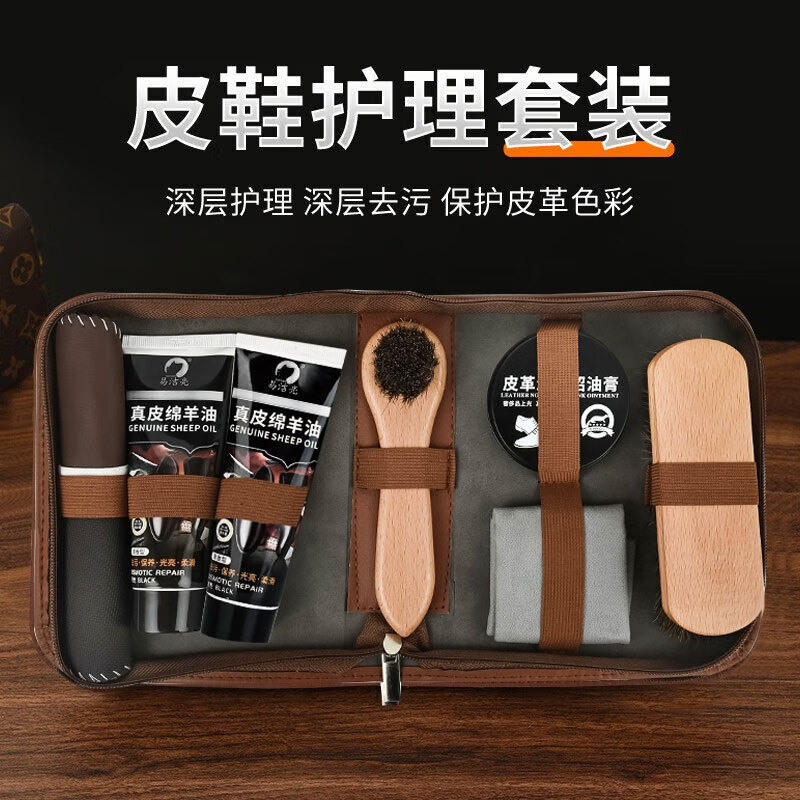 易洁亮鞋油套装擦皮鞋油黑色无色通用貂油鞋刷鞋擦工具8件套(黑色两支