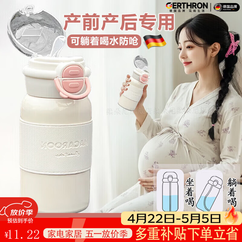 GERTHRON德国孕产妇保温杯专用高颜值躺着喝水杯子坐月子必备成人女吸管杯 雅白母婴级316 【双饮款-500ML】