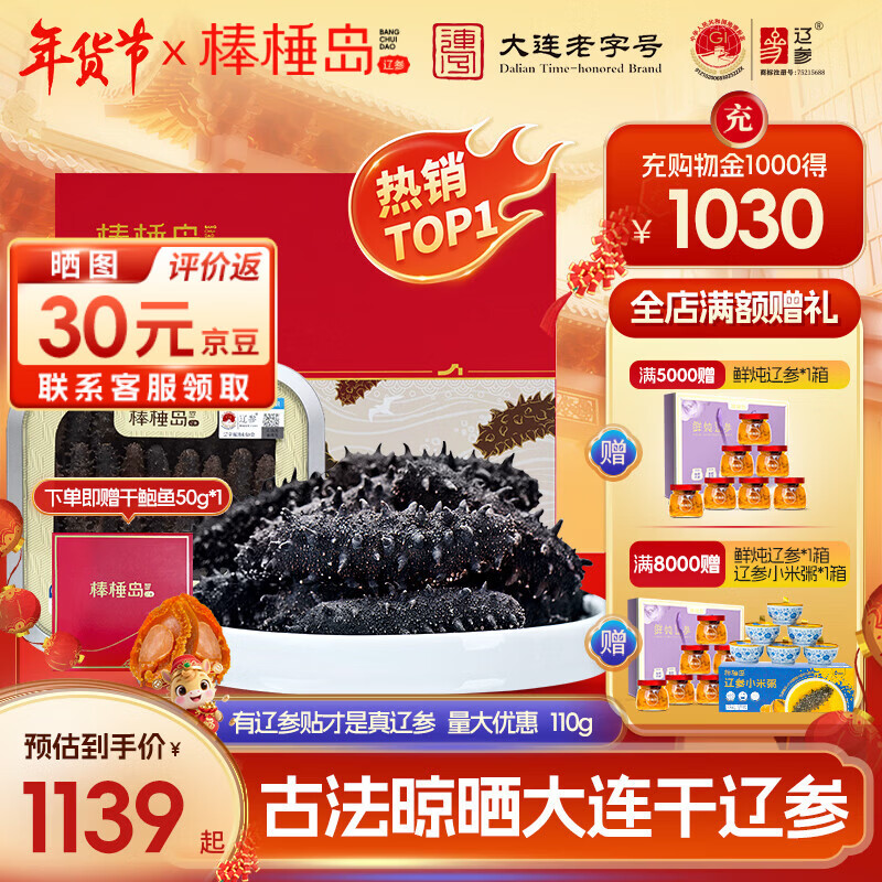 棒棰岛大连干海参海参干辽刺参海鲜孕妇滋补干货海鲜送礼年货礼盒特产 【入会立减20】25-35只 110g*1盒 礼盒款