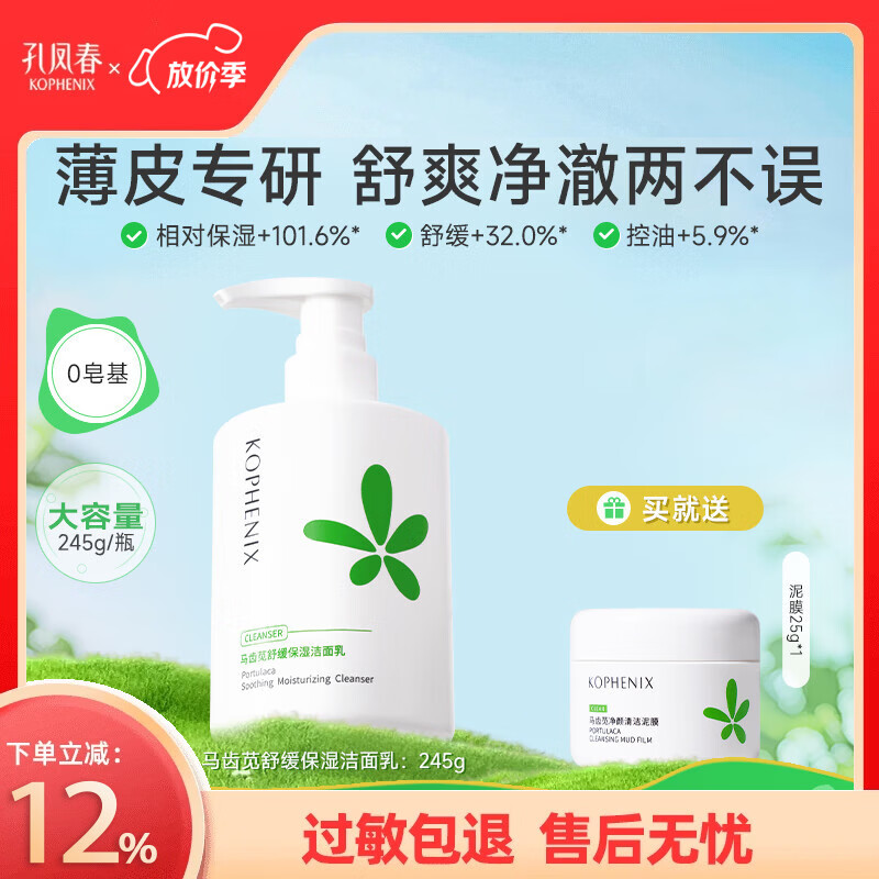 孔凤春氨基酸舒缓洁面乳马齿苋深层清洁舒缓保湿补水洗面奶温和不刺激 245g(保湿洁面-赠泥膜25g)