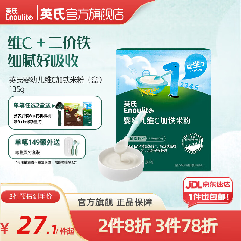 英氏米粉婴儿高铁独立小包装宝宝米粉荤素果蔬6-12个月米糊婴儿细腻 【1阶6月+】维C加铁便携 135g*1盒