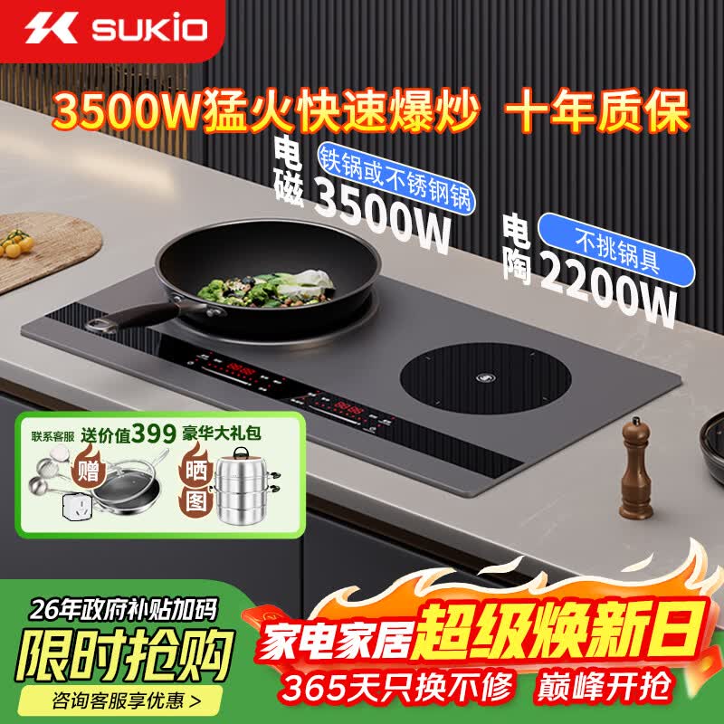 硕高电磁炉 家用嵌入式3500W双灶大功率爆炒 电磁炉电陶炉 电池炉凹面一套带锅独立控温 左凹右平OG009