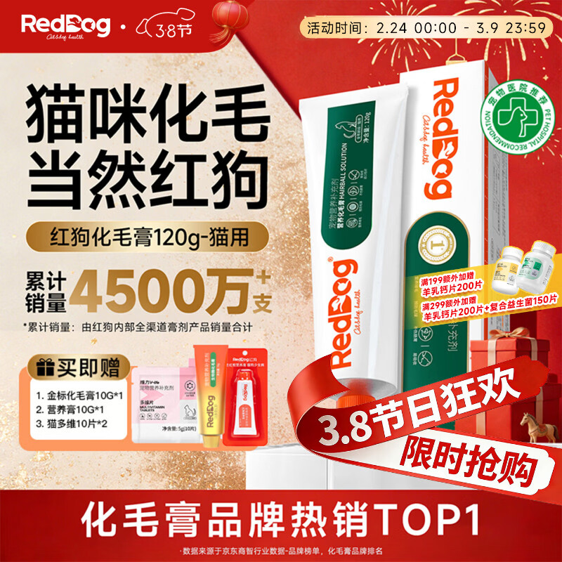 RedDog【医师推荐】红狗化毛膏猫咪专用排毛球去毛膏鱼油维生素乳铁蛋白 经典化毛膏 120g*1盒