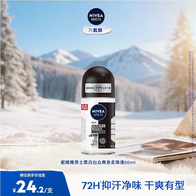 妮维雅(NIVEA)男士黑白出众爽身走珠液香体露持续干爽滚珠腋下干爽香体液止汗露 黑白爽身走珠50ml