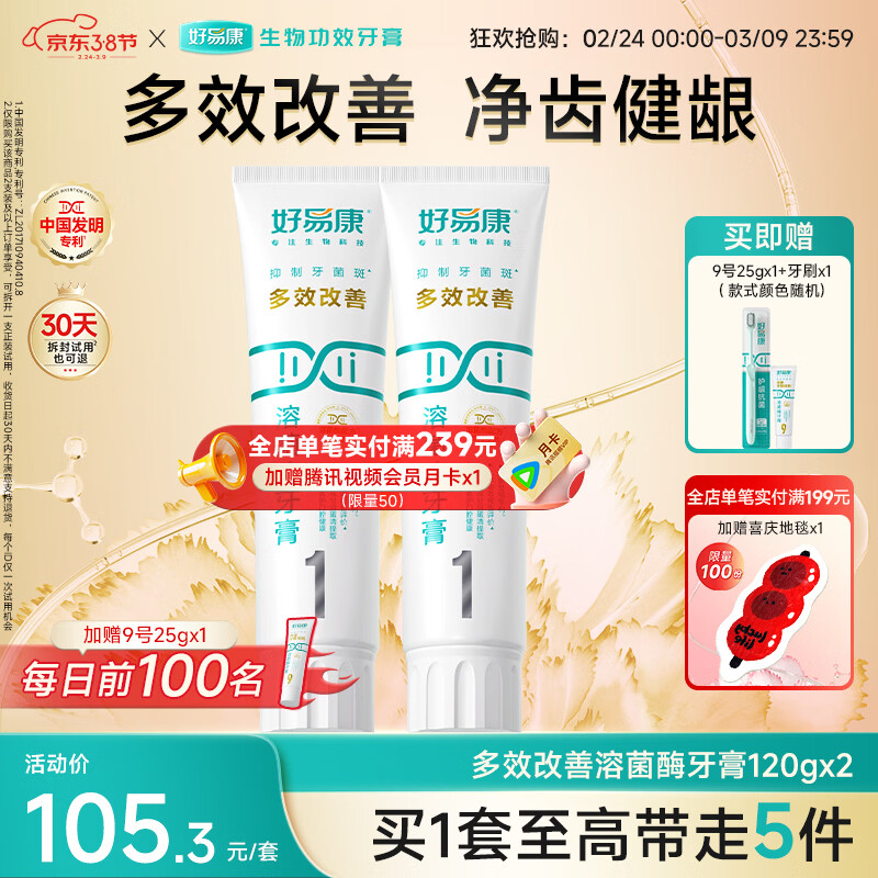 好易康溶菌酶牙膏 清新口气抑制牙菌斑洁白去渍多效养护 1号2支装【120g*2】