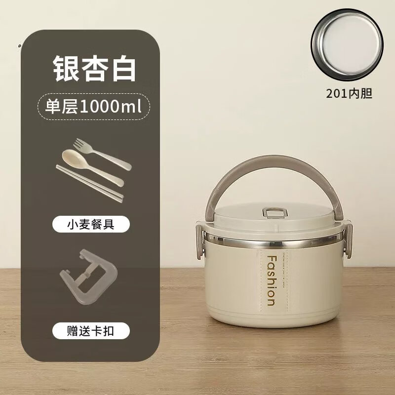 【精选】层层密封保温饭盒桶上班族不锈钢带盖餐盒微波炉加热便当 一层+餐具 201不锈钢银杏白