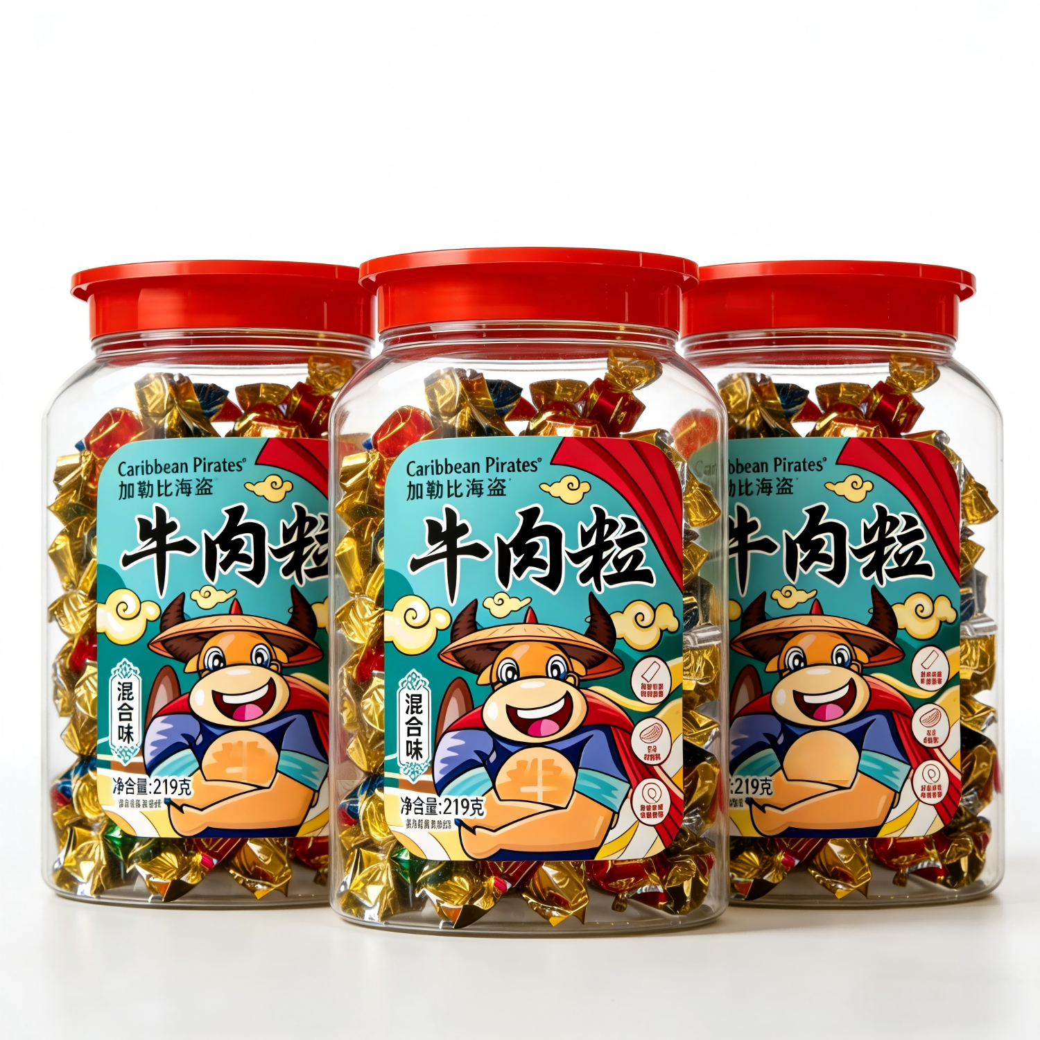 加勒比海盗牛肉粒 混合口味罐装休闲零食肉干肉脯熟食小吃特色食品 219g*3罐装