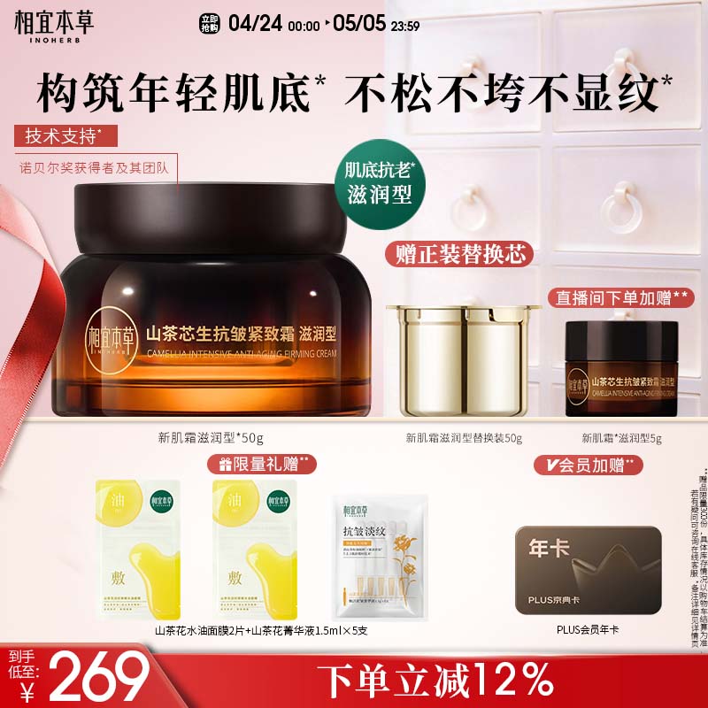 相宜本草山茶芯生抗皱紧致霜滋润型50g新肌霜+替换装护肤品送女生