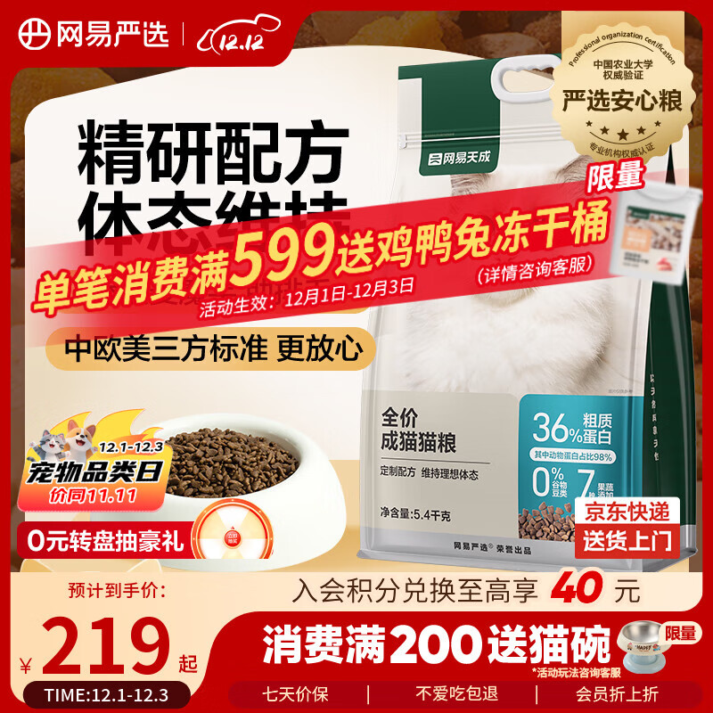 网易严选全价成猫粮 宠物主粮猫咪三文鱼无谷 体态维持助排毛 5.4kg/袋