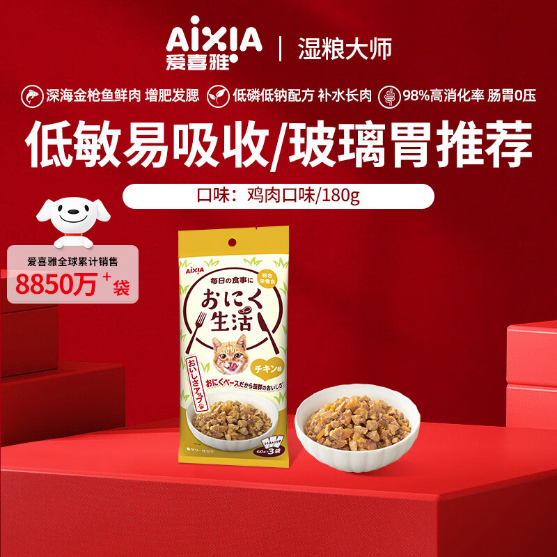 爱喜雅AixiA进口成年猫粮猫湿粮吃肉生活营养鲜封包鲜肉湿粮主粮零食 鸡肉味 180g 3袋1包