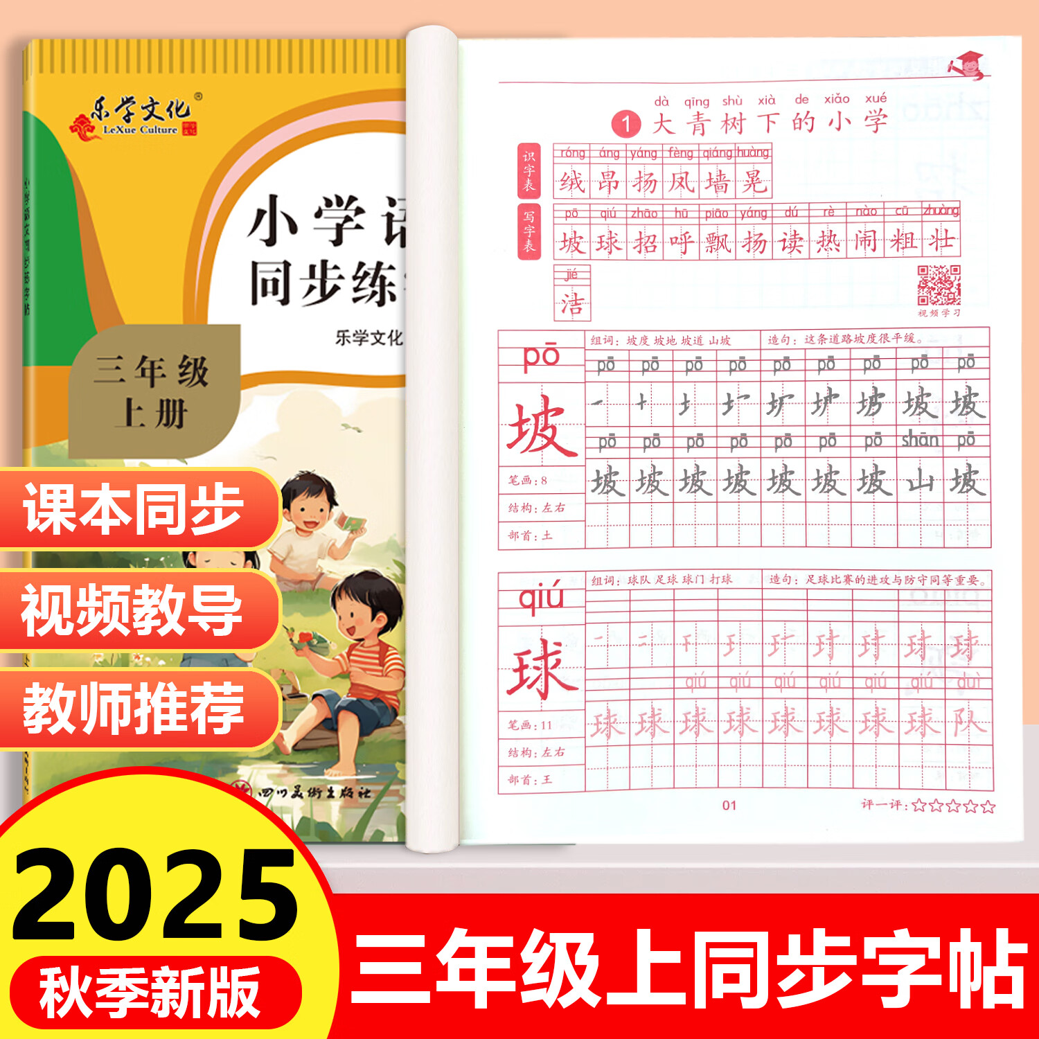 乐学文化2025新版字帖儿童一二三年级练字帖小学生专用上下册人教版语文同步练字本描红笔画笔顺临摹练习贴 视频版三年级上册同步字帖100页10铅笔2握笔器