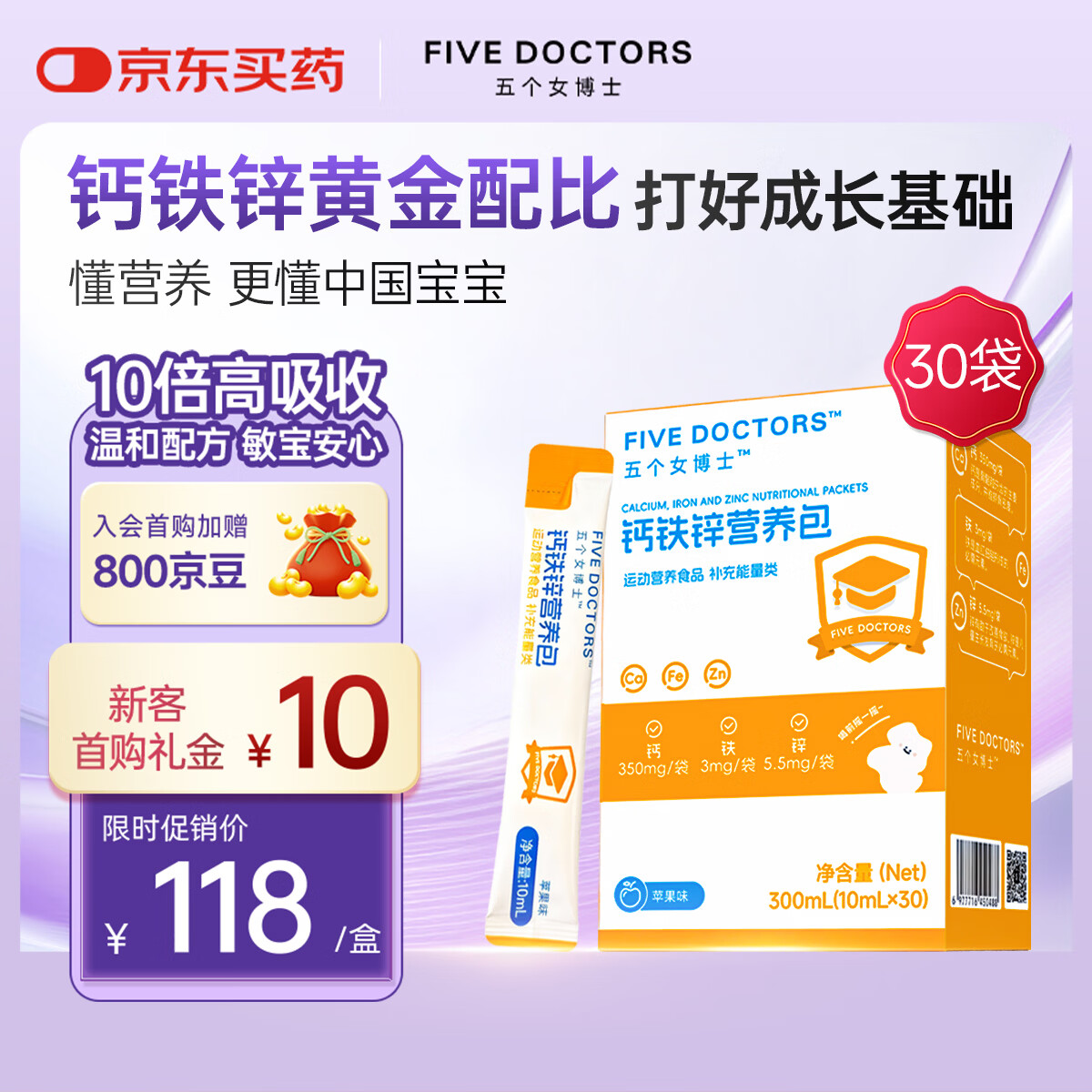 五个女博士(FIVEDOCTORS)钙铁锌营养包有机柠檬酸钙 儿童成长营养 苹果味10ml*30支