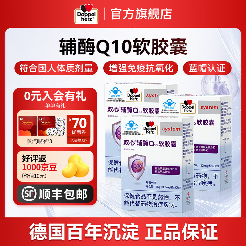 双心(Doppel herz)辅酶Q10软胶囊 增强免疫力抗氧化 蓝帽认证 辅酶Q10 蓝帽 60粒*3盒 巩固效果