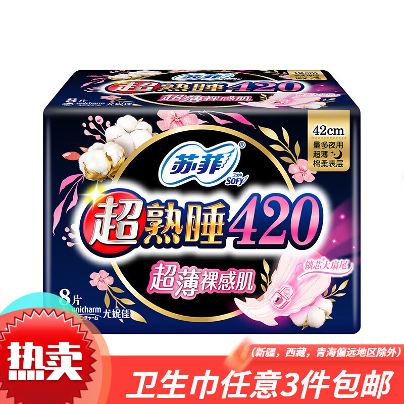 苏菲卫生巾超熟睡420/350/290超长夜用量多日用女生姨妈巾 420mm裸感肌8片