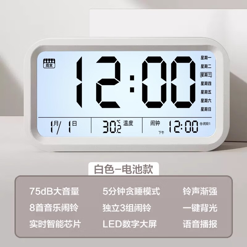 【严选好货】闹钟学生专用起床儿童男女强力叫醒桌面智能电子时钟 白色-【电池款】
