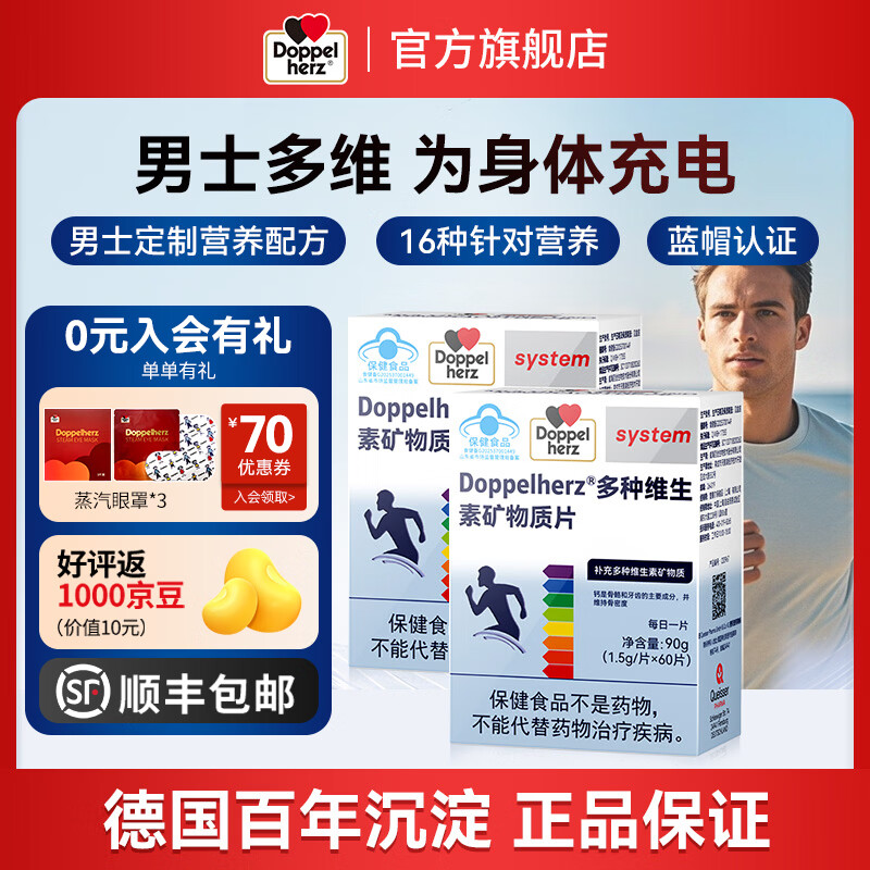 双心(Doppel herz)复合维生素矿物质片16种多维烟酰胺叶酸补充活力 蓝帽认证 男士复合多维 60粒*2盒 【1周期】
