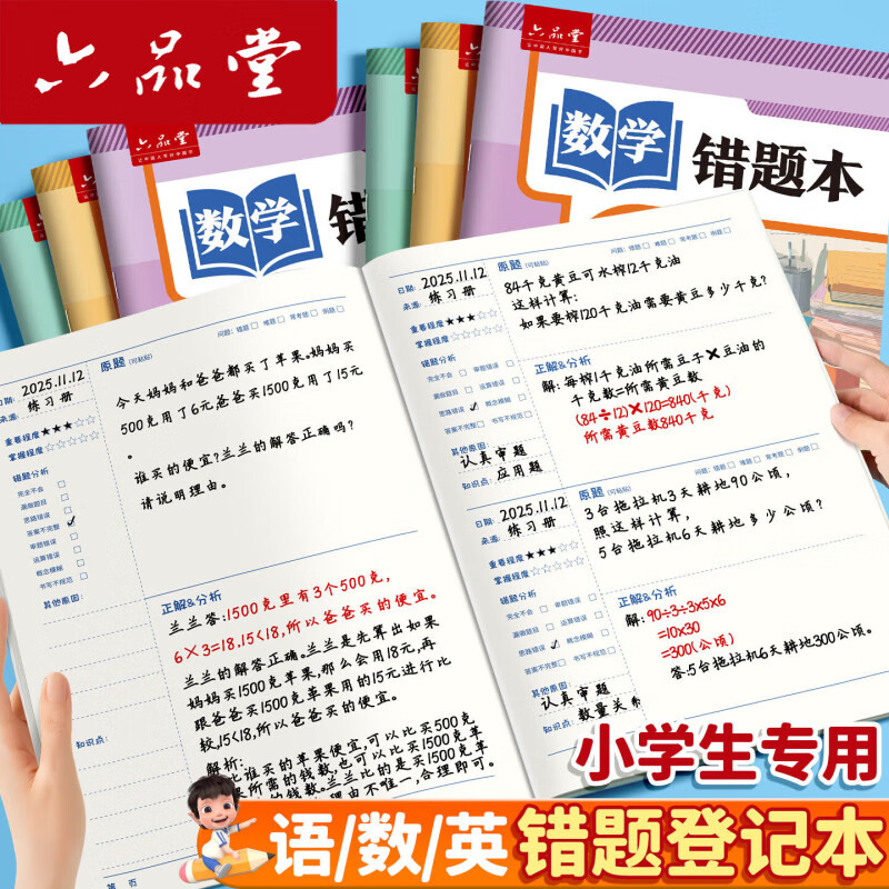 六品堂数学错题本小学生专用纠错本子小学一二三四五六年级语文英语改错整理神器订正本错字加厚作业记录 【共4本】数学+语文(各2本)64页/本