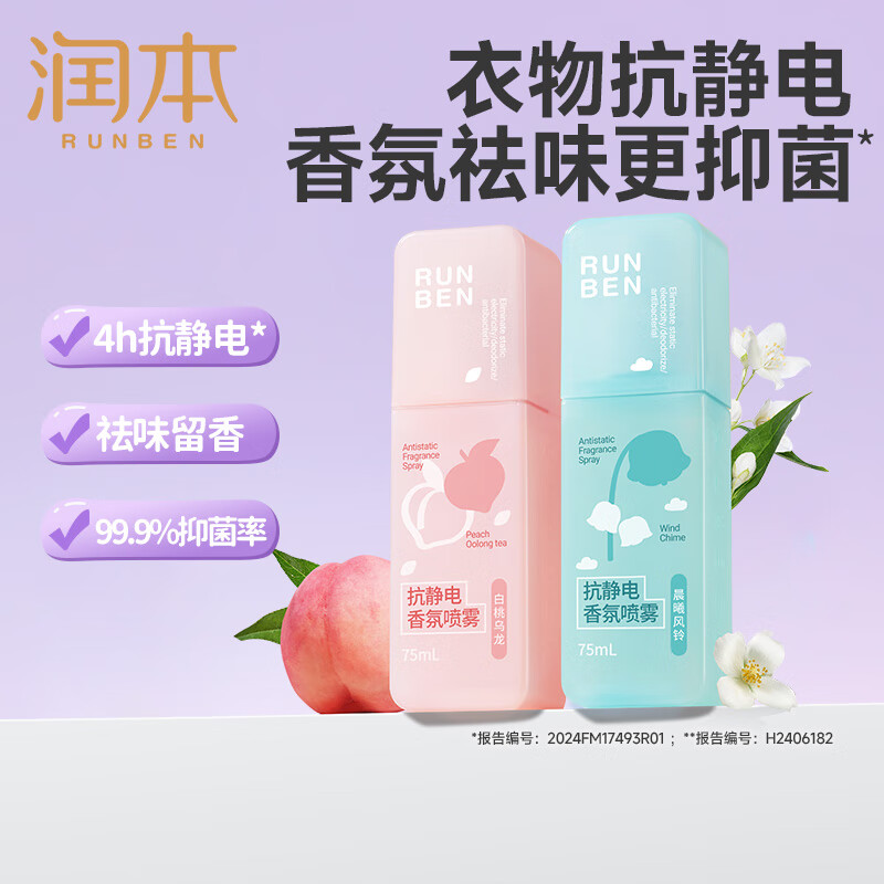 润本(RUNBEN)防静电喷雾毛衣物除静电衣服除菌祛味除皱柔顺剂香氛便携静电喷雾 【晨曦+白桃】 75ml*2瓶