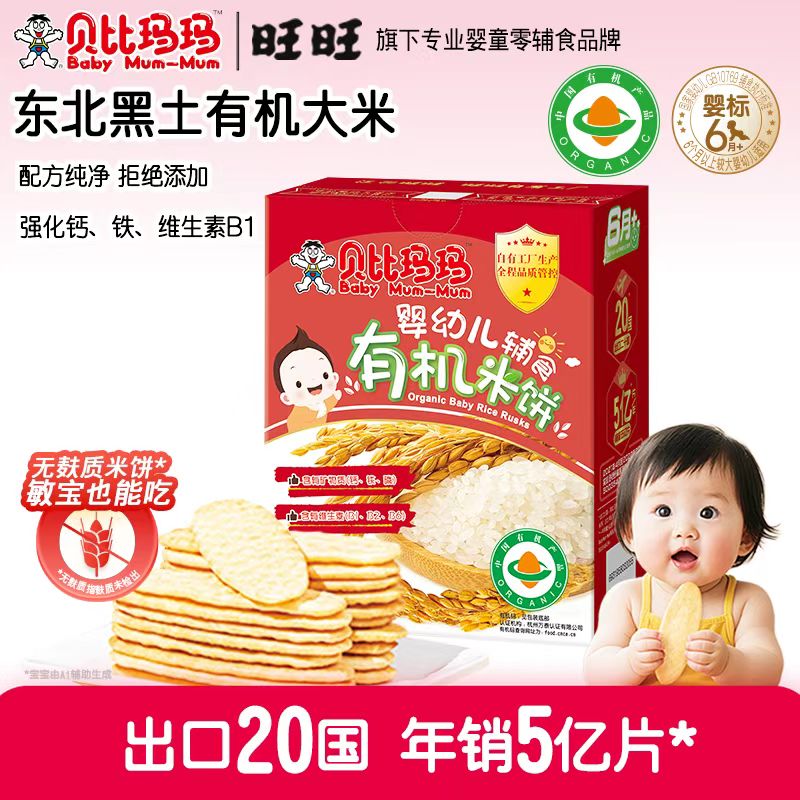 贝比玛玛旺旺婴幼儿有机米饼儿童婴儿零食宝宝磨牙棒饼干原味40g6个月以上