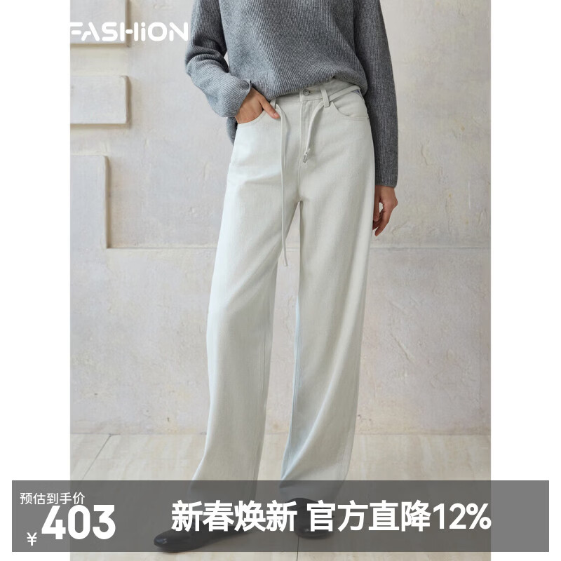 【京东直采】26新款复古水洗抽绳牛仔弯刀长裤女百搭阔腿直筒裤 灰白色 现货 常规 M