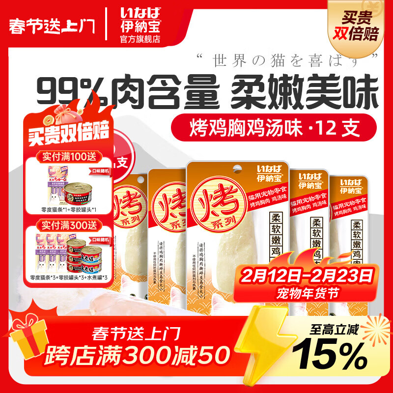 伊纳宝猫零食 烤鸡胸肉 妙好水煮鸡胸肉成幼猫通用营养宠物肉干肉条奖励 鸡汤味12支