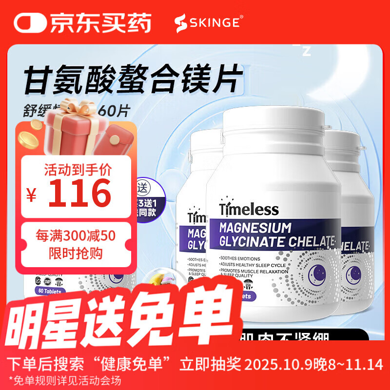 TIMELESS甘氨酸镁片放松肌肉睡眠失眠舒缓情绪 四瓶周期装【买3送1】