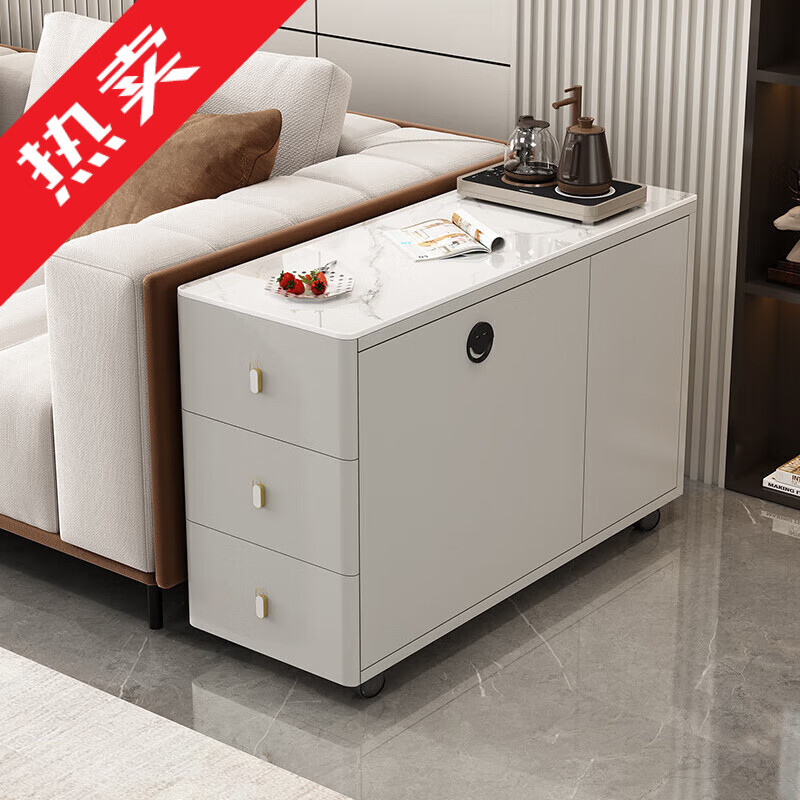 HANYUBABY【包安装】边几客厅沙发边柜置物柜现代轻奢岩板小茶几家用可移动 两门三抽80*50*60【奶咖色】