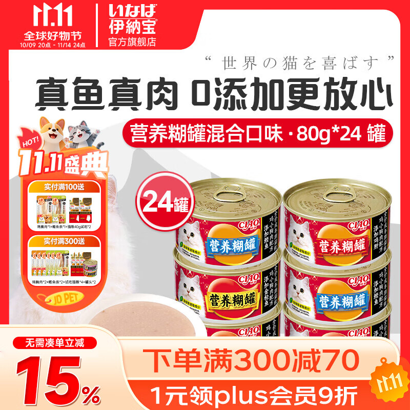 伊纳宝猫罐头营养糊罐头肉泥罐补水美味汤罐金枪鱼罐头猫饭冬季骗水 随机混合口味80g*24