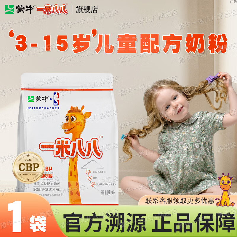 蒙牛一米八八儿童成长奶粉 3-15岁儿童成长高钙生牛乳益生菌早餐奶粉 300g一袋装