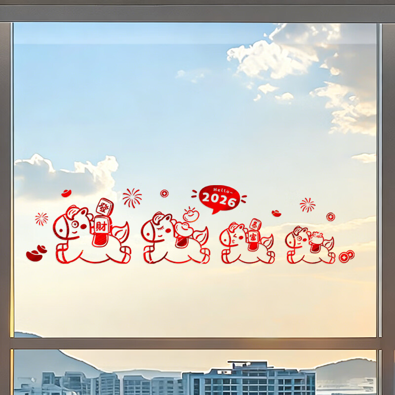 玖岩窗花2026新款马年新年装饰窗贴纸客厅过年窗户氛围布置玻璃门贴画 小马送福来 升级拉丝金材质
