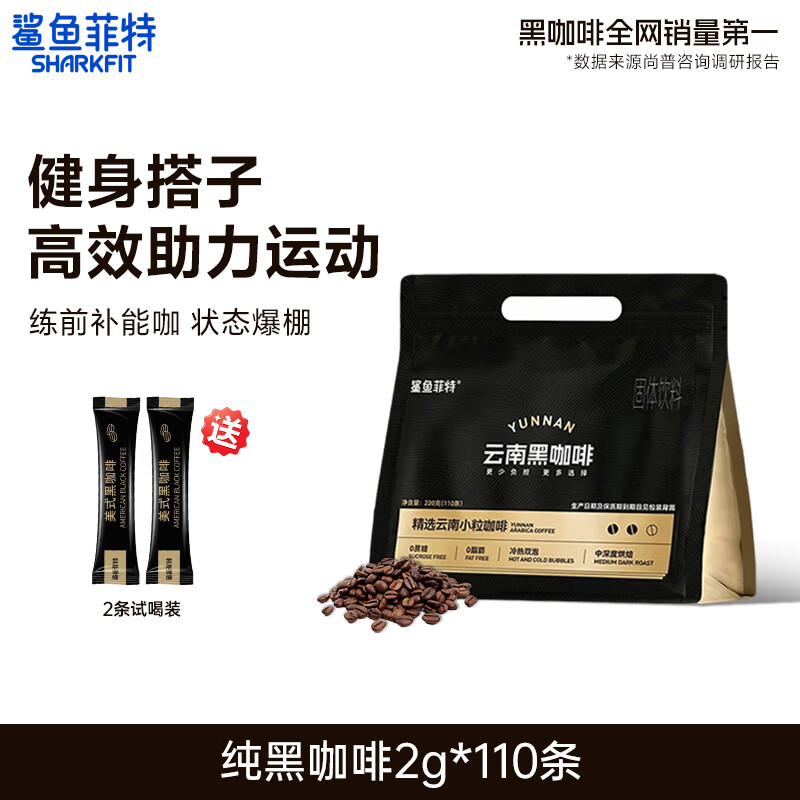 鲨鱼菲特(SHARKFIT)黑咖啡运动健身减燃0脂0蔗糖美式速溶提年货新年云南咖啡粉 【2g*110条】110杯黑咖啡