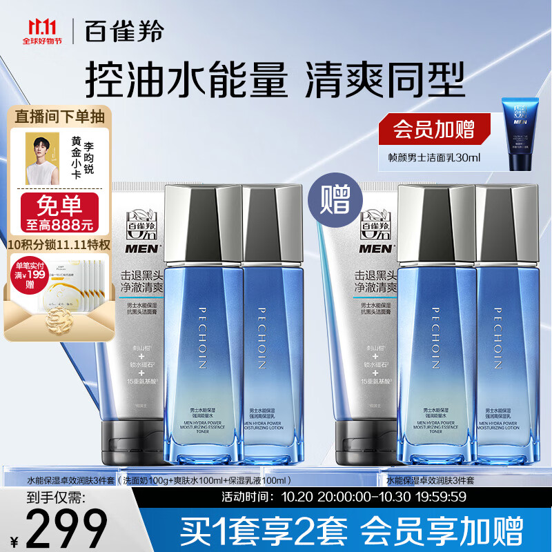 百雀羚(PECHOIN)护肤套装男士水能保湿(洁水乳)保湿紧致品质国货(随机发货)