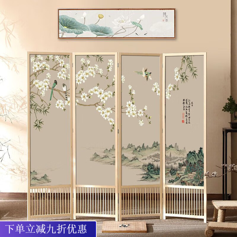 倘然之家实木屏风隔断现代简约家用折叠移动客厅卧室书房遮挡屏酒店办公室 国画小鸟 1.8米高x0.48米宽*3扇