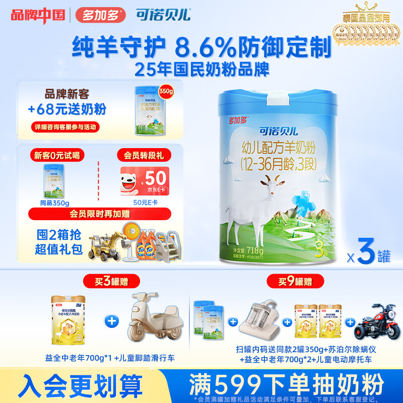 可诺贝儿多加多幼儿配方羊奶粉3段12-36月龄宝宝羊奶粉幼儿3段718g 可诺3段718g*3