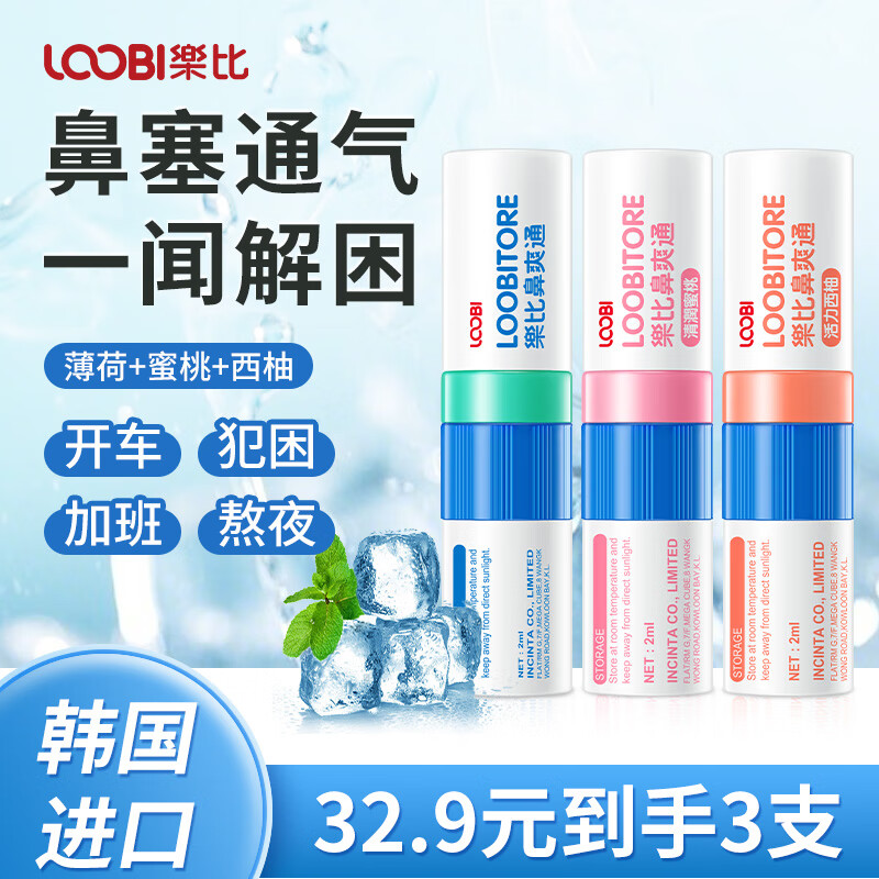 乐比(LOOBI)韩国进口鼻爽通鼻通棒鼻塞吸式上班防瞌睡加班开车鼻塞通气薄荷棒 鼻通薄荷+蜜桃+西柚3支