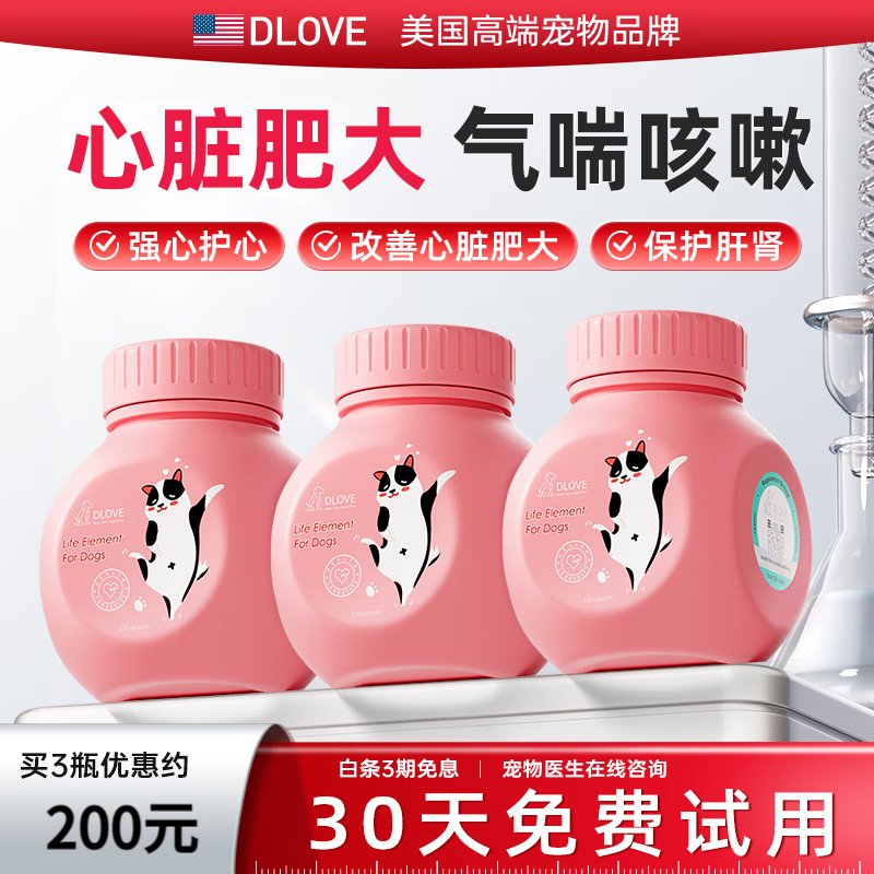 萌护卫美国DLOVE生命元水溶辅酶q10宠物保护心脏犬猫气喘咳嗽心脏肥大 3瓶【犬用强化版】360粒 30天试用
