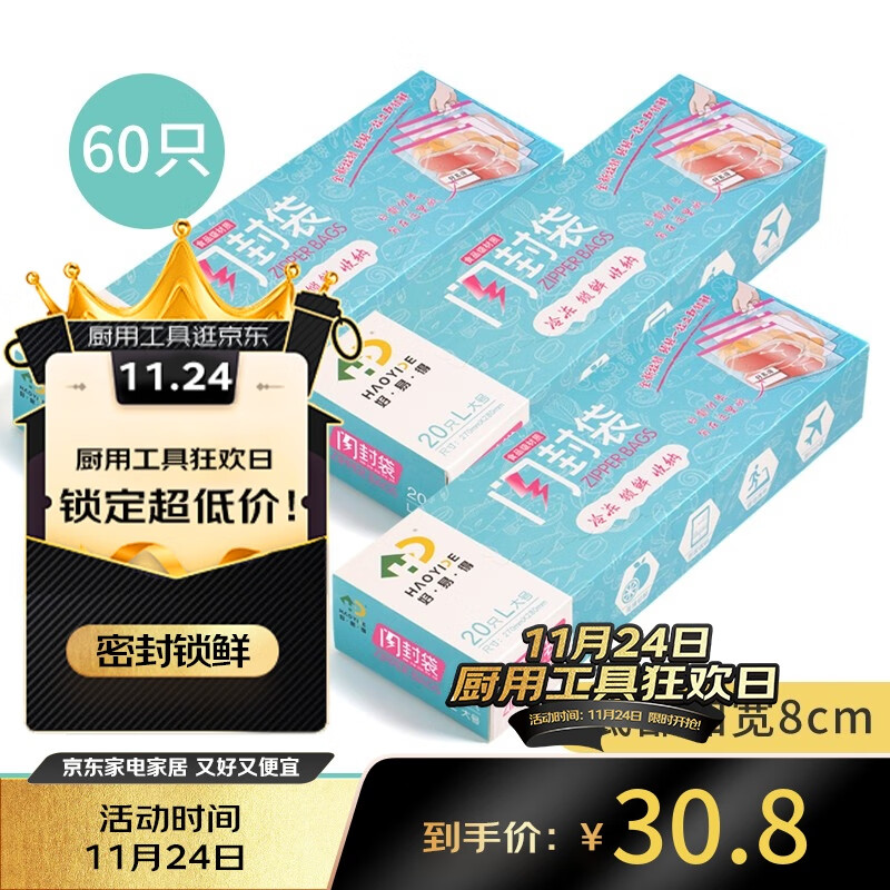 好易得 加厚食品密封袋拉链式自封口闪封保鲜袋加宽可站立防潮可重复用 大号3盒共60只