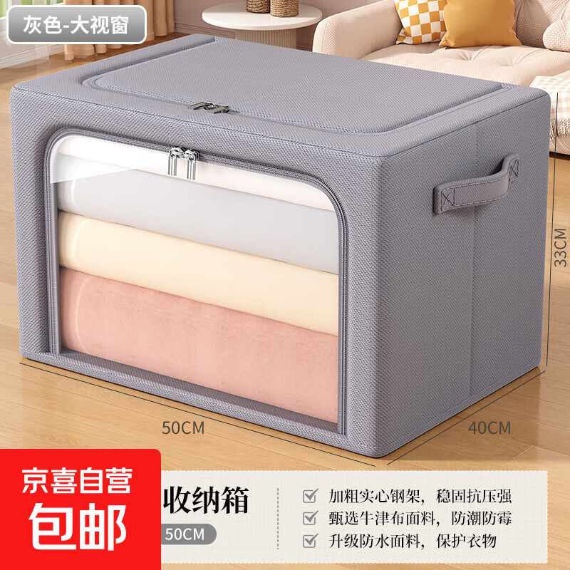 京东物流 布艺收纳箱整理收纳盒衣服收纳加大可折叠收纳储物箱 【实芯钢架】支撑力强 牛津布款 50*40*33cm 72L 灰色 1个