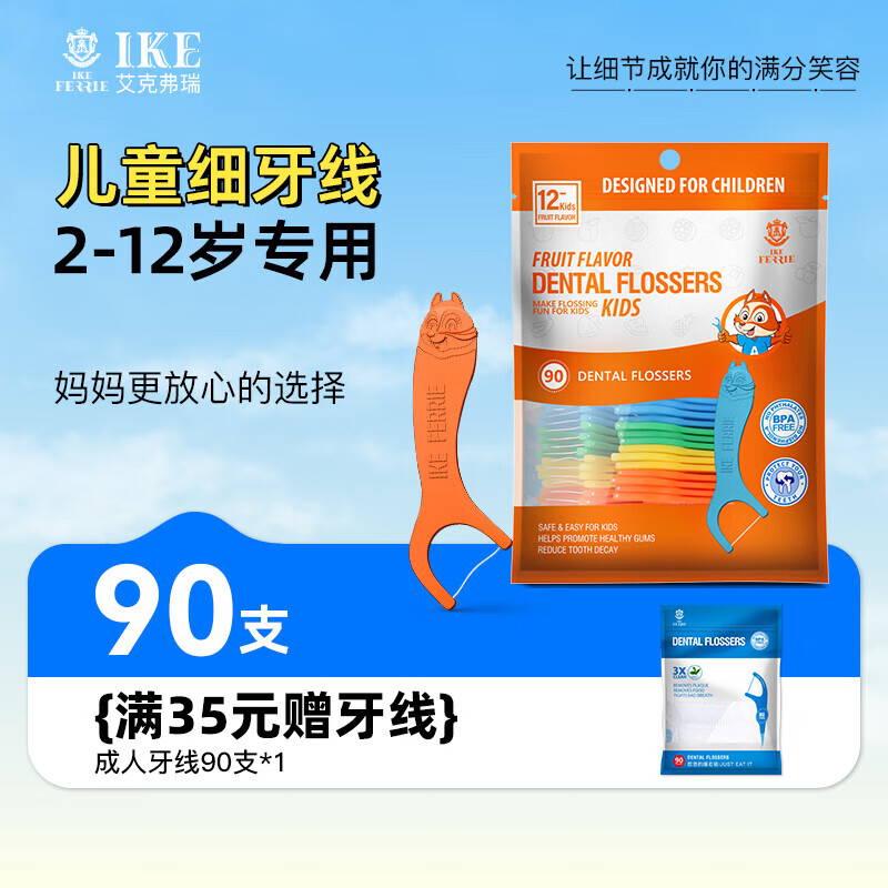 艾克弗瑞儿童牙线独立包装细滑便携柔韧扁线牙线棒剔牙牙签清洁牙缝薄荷味 儿童防蛀牙线90支*2包